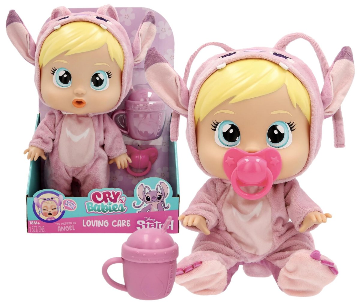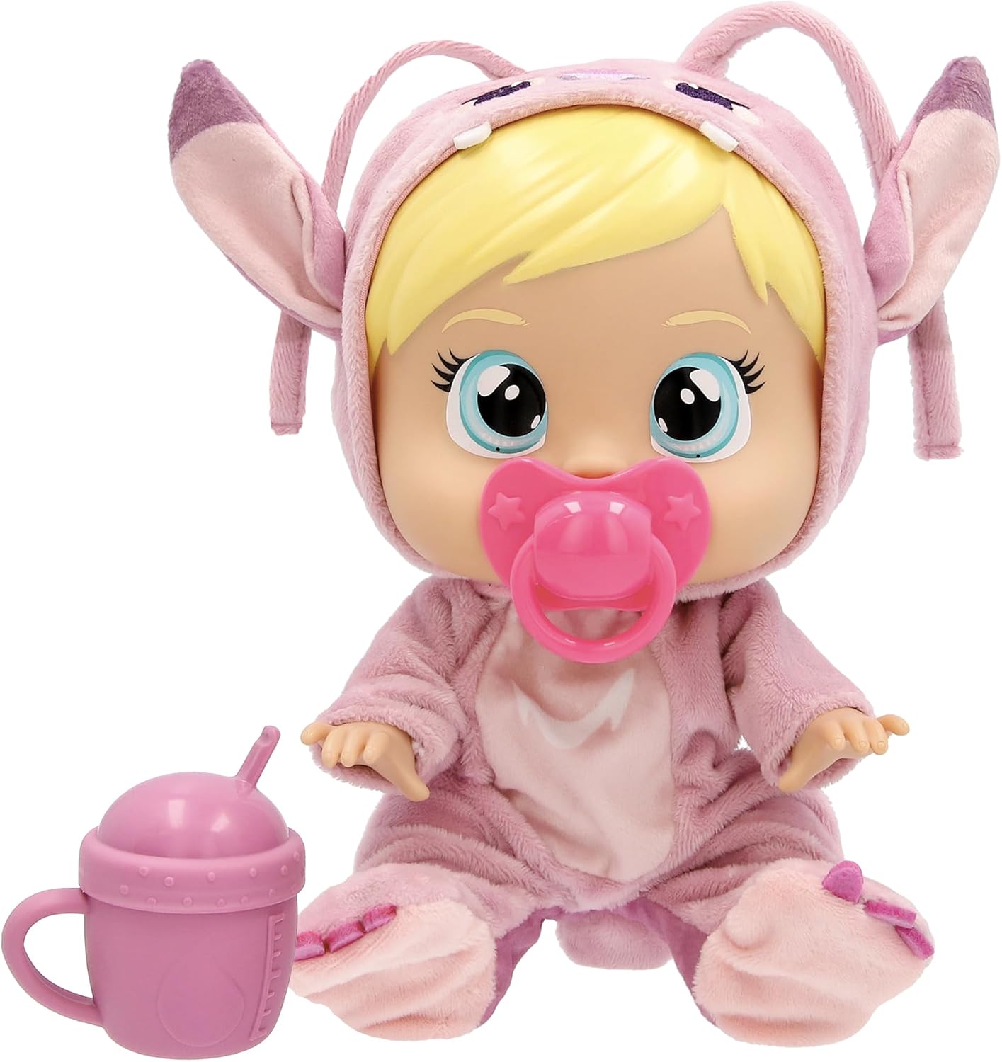 Nalejte vodu do špeciálnej nádoby a bude plakať naozajstné slzy. Do úst bábiky je možné vložiť cumlík.