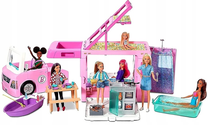 Až nastane čas na objavovanie, odpojte prednú časť obytného vozidla a získate auto so štyrmi sedadlami. Mrknite sa pod zadné sedadlá auta a nájdete tú loďku, ktorá sa skvele hodí na rybársku výpravu! Až sa v predstavách zrodí nápad utáboriť sa, otvorte bočné panely, aby ste pretvorili toto obytné vozidlo na kempovaciu hernú sadu s množstvom priestoru, kde sa môžu najesť, prespať a hrať sa štyri bábiky. Sklopením jednej strany získate bazén a sklopením druhej senzačný vonkajší kuchynský kút, ktorý nabáda k zábavnému vareniu.