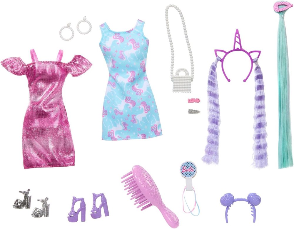 Deti si môžu vzhľad svojej bábiky prispôsobiť pomocou 10 módnych a vlasových doplnkov, vrátane ďalších šiat s potlačou, ďalšieho páru topánok a kabelky! Stylingové doplnky zahŕňajú čelenku a sponku s farebnými pramienkami vlasov, čelenku s drdolmi, sponky a gumičky do vlasov. Akonáhle deti dokončia svoje majstrovské diela vo forme účesov, môžu pomocou kefy vyčesať bábike Barbie® jej kadere a užiť si hodiny zábavy! Deti môžu ľahko premeniť jej vzhľad pomocou kombinácie módnych doplnkov a účesov - od vytvárania účesov a vrkočov, až po zdobenie farebnými prvkami, možnosti sú nekonečné!