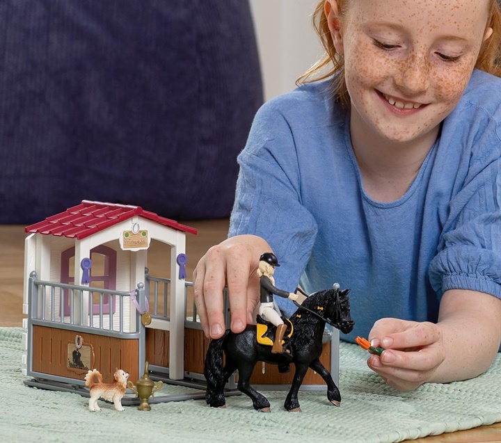 Pekne maľovaná a detailne spracovaná stajňa od Schleichu s odnímateľnou strechou a otváracími dverami. To najkrajšie miesto na ustajnenie koňa. Jazdkyňa Tori dokáže sedieť, stáť a brať predmety.